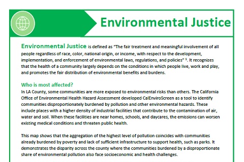 For more information on Los Angeles County's efforts to achieve environmental justice, please visit the Center for Health Equity website or see the Center for Health Equity Fact Sheet (English) | Hoja Informativa del Centro de Equidad en Salud (Español)